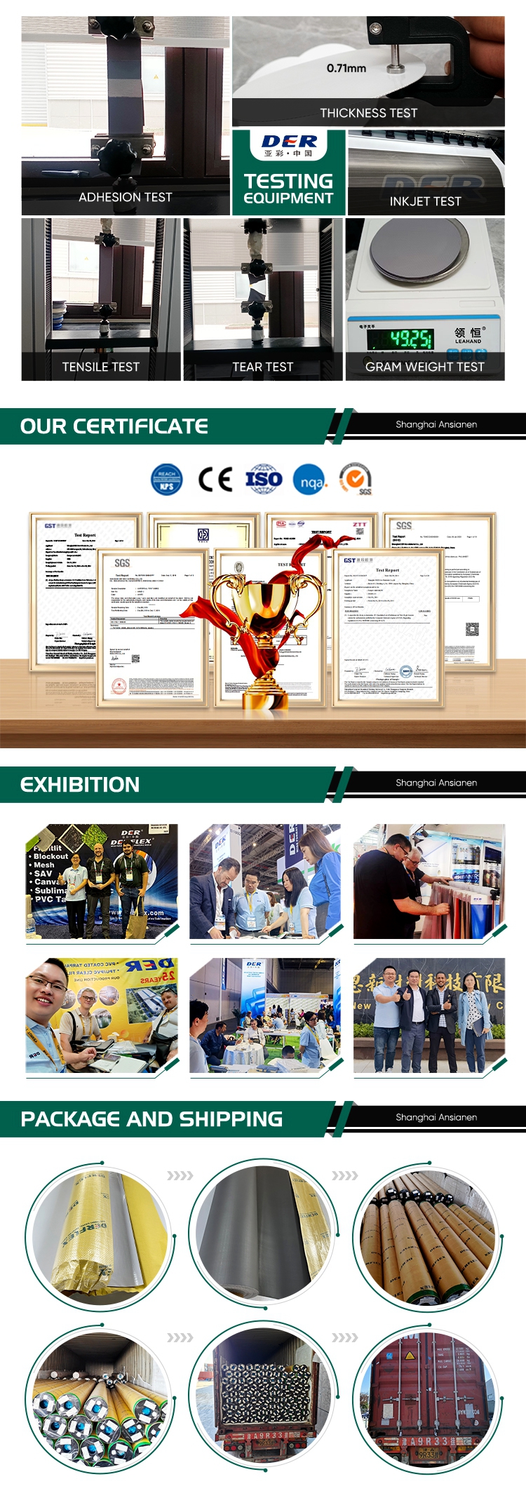 为了确保运输安全与客户操作便利,我们的 PVC涂层篷布 均采用卷装包装,外覆牛皮纸+珍珠棉防护层,并贴有清晰的规格标签。每一批产品在出厂前都经过严格的质量检测,包括拉伸强度测试、撕裂测试、剥离强度测试及色差检测,确保产品性能稳定、使用寿命长。
