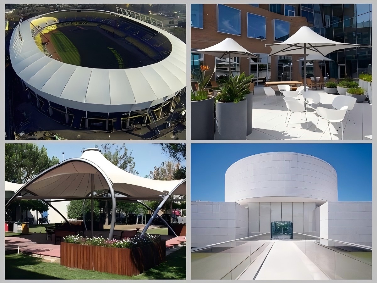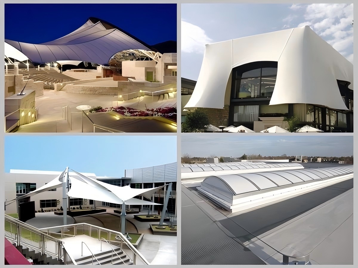 PVC architectural fabrics can be shaped into complex 3D tensile membrane structures. Architects can achieve creative, lightweight, and futuristic designs while minimizing steel framework requirements.