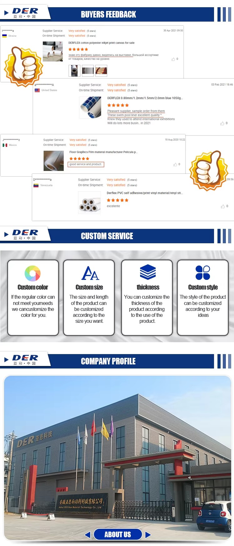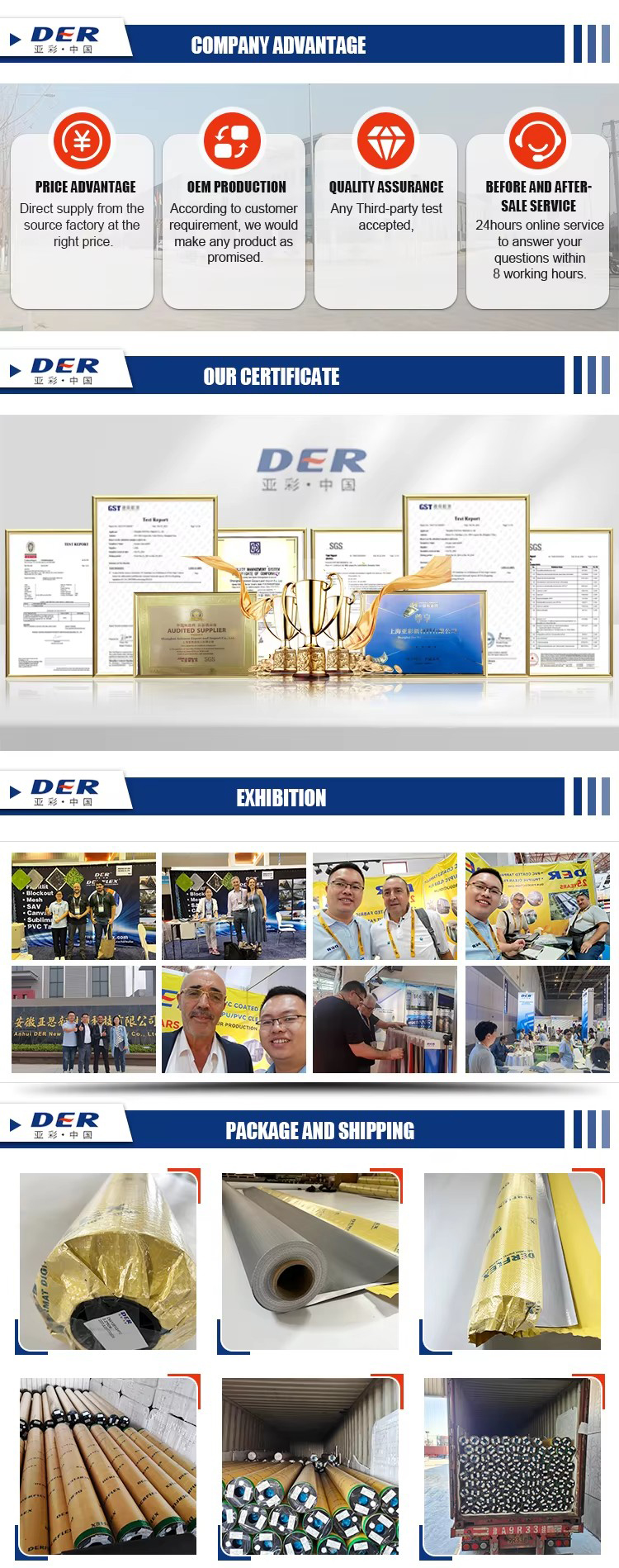 Anhui DER New Materials Co., Ltd. is a leading China truck tarpaulin cover manufacturer with over 20 years of industry experience. We specialize in PVC tarpaulins, coated fabrics, and heavy-duty textiles, providing customized solutions for logistics, construction, agriculture, and industrial applications. With advanced production equipment, strict quality control, and global distribution, DER delivers high-performance tarpaulins trusted worldwide.